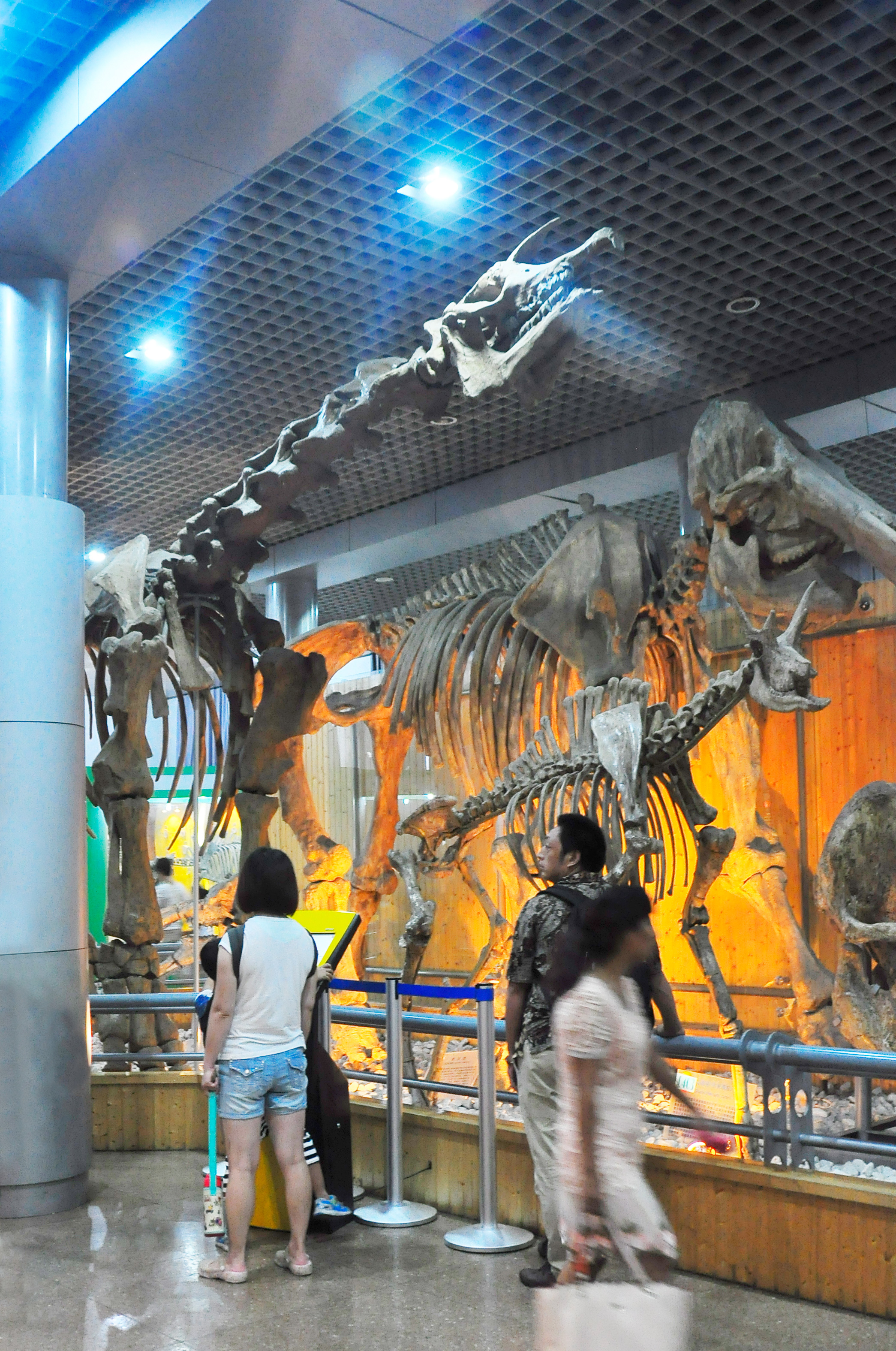 迎面而来的是好巨大的恐龙骨骼化石,恐龙的头部已经伸到画面之外了,呵呵,你就是马门溪龙吧~