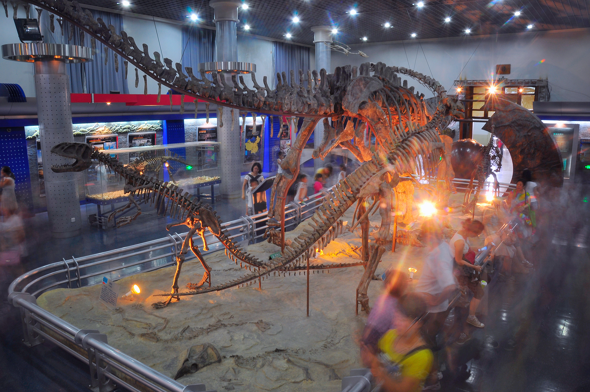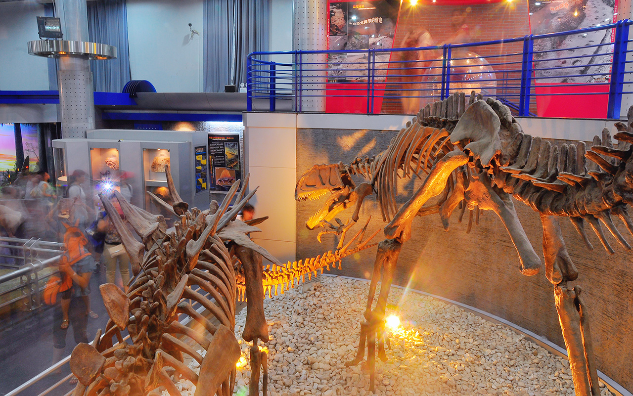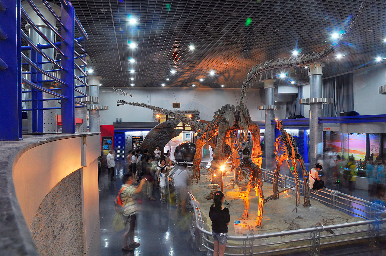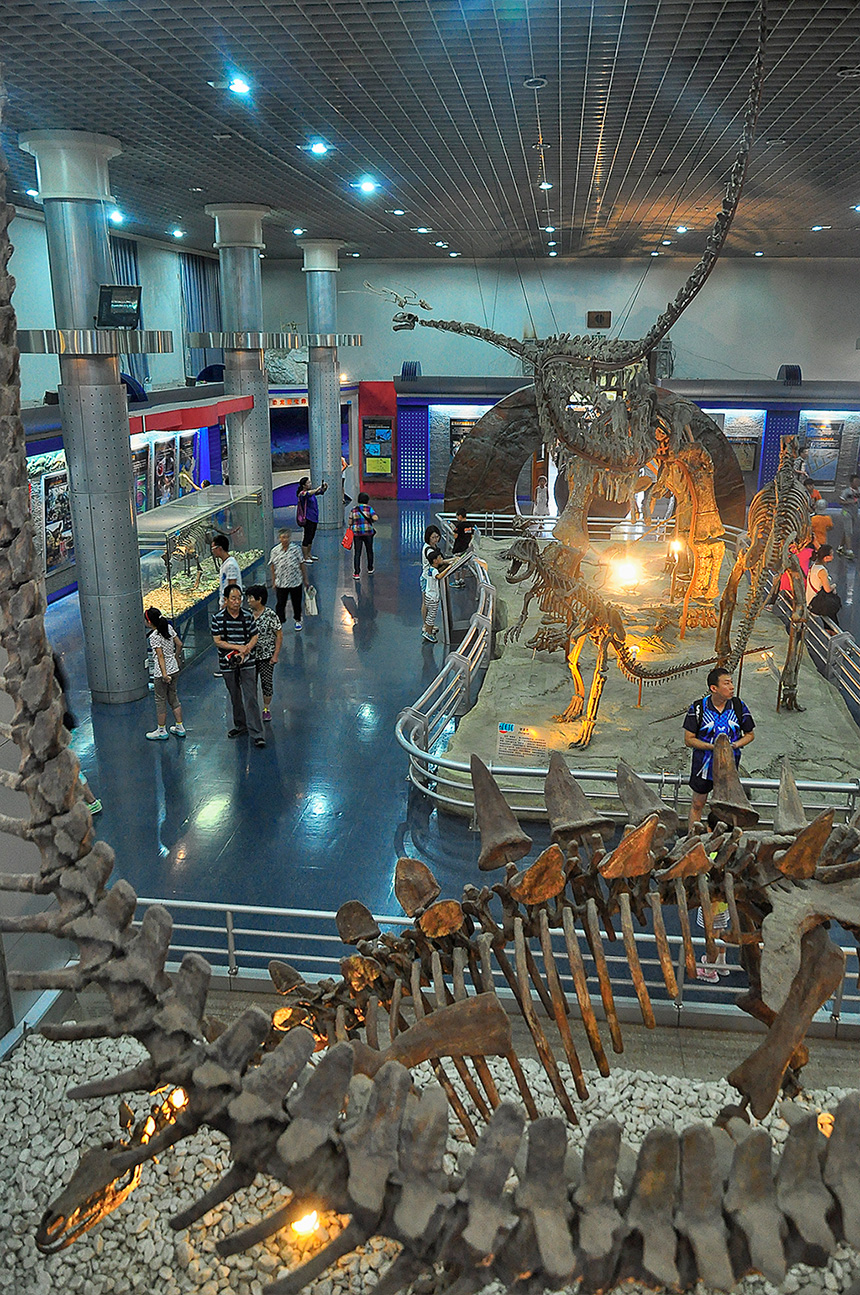 这里展示了生物界两亿多年前的景观。大厅中央是庞大的恐龙骨架群-------中国人发现的第一条恐龙——【许氏禄丰龙】。体长达26米的井研【马门溪龙】,称王称霸的【霸王龙】,小巧玲珑的【恐爪龙】,背上布满剑板的【沱江龙】,威风凛凛的【永川龙】,展翅翱翔的【翼龙】,称霸海洋的【鱼龙】......[LY:0156]