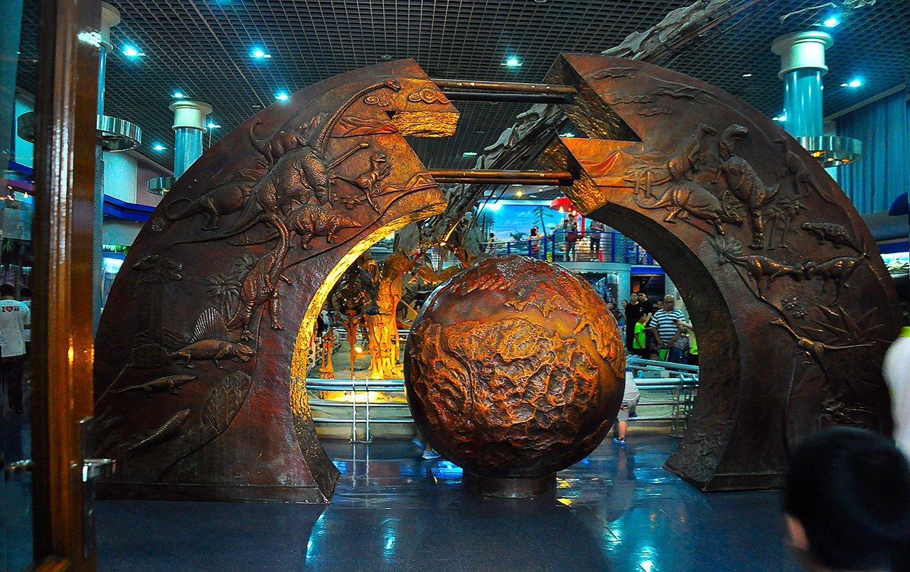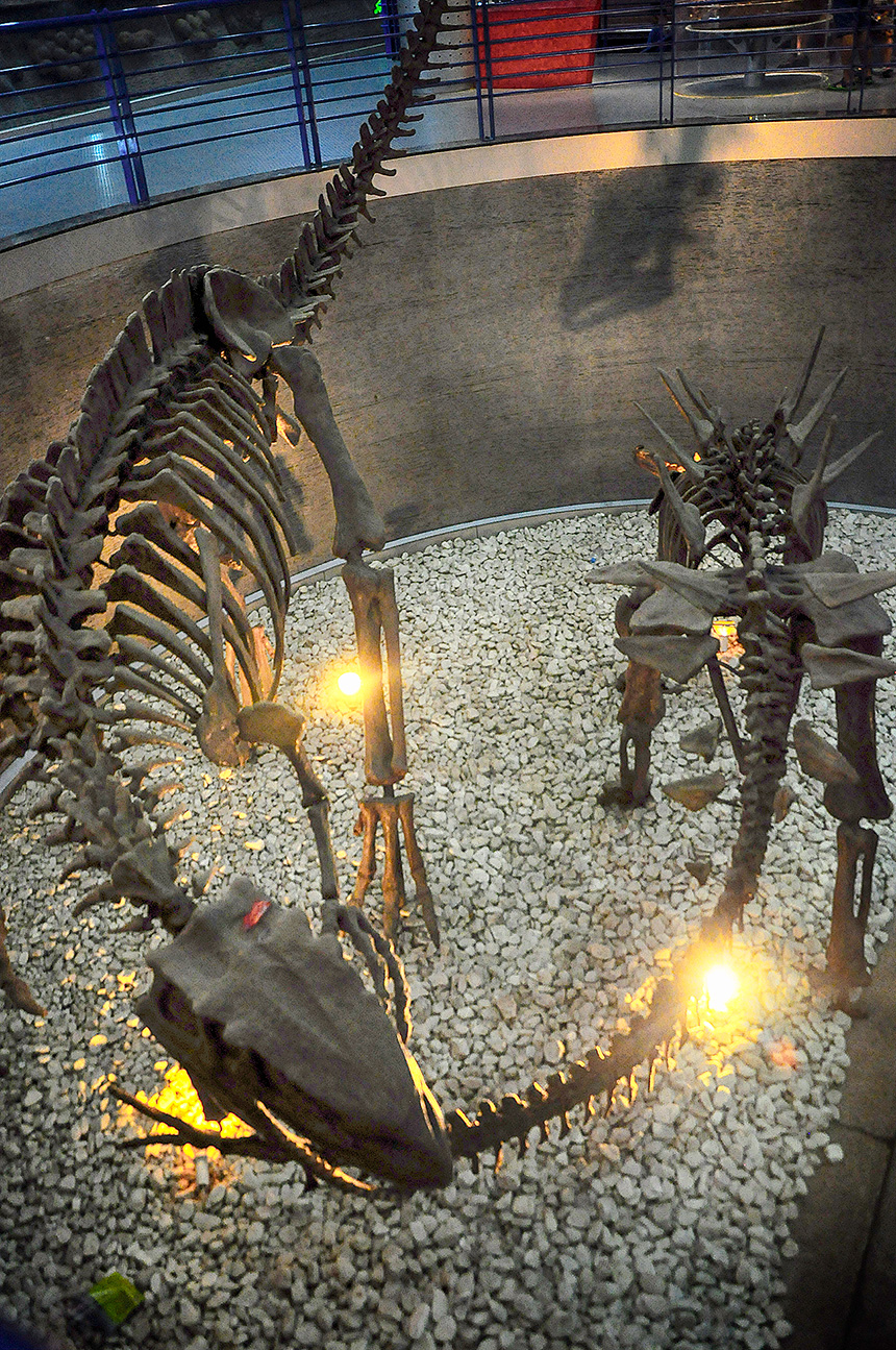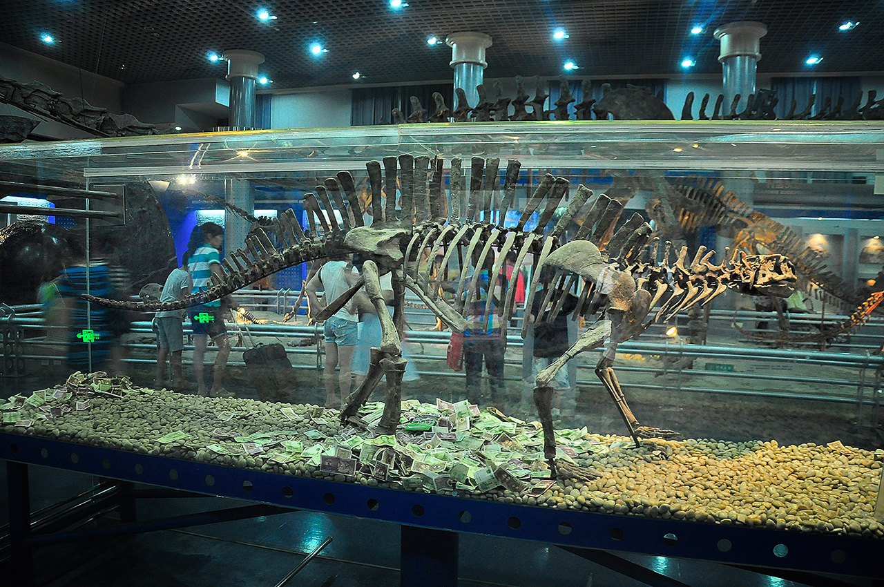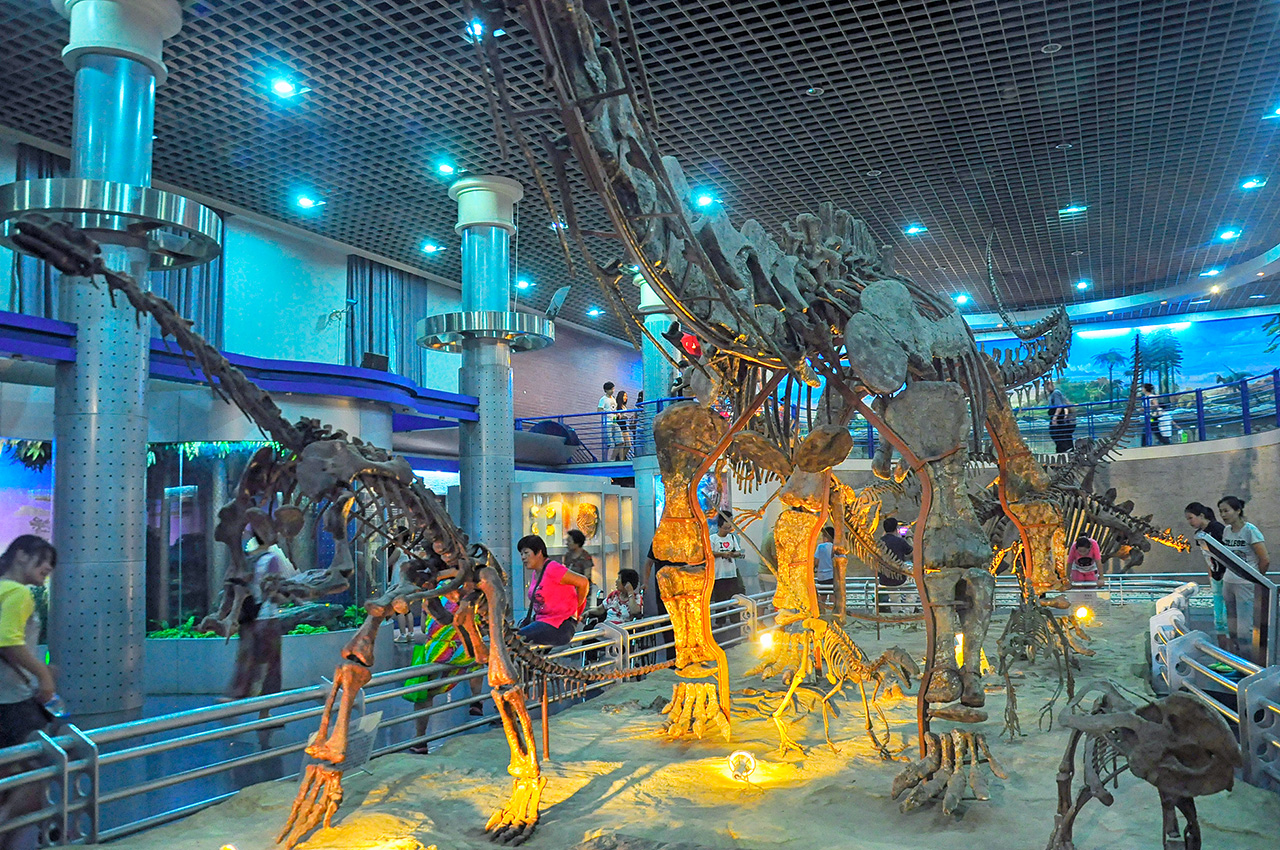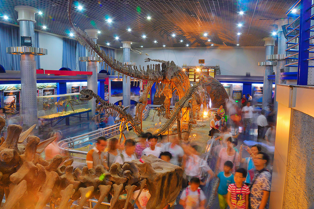 这里展示了生物界两亿多年前的景观。大厅中央是庞大的恐龙骨架群-------中国人发现的第一条恐龙——【许氏禄丰龙】。体长达26米的井研【马门溪龙】,称王称霸的【霸王龙】,小巧玲珑的【恐爪龙】,背上布满剑板的【沱江龙】,威风凛凛的【永川龙】,展翅翱翔的【翼龙】,称霸海洋的【鱼龙】......[LY:0156]