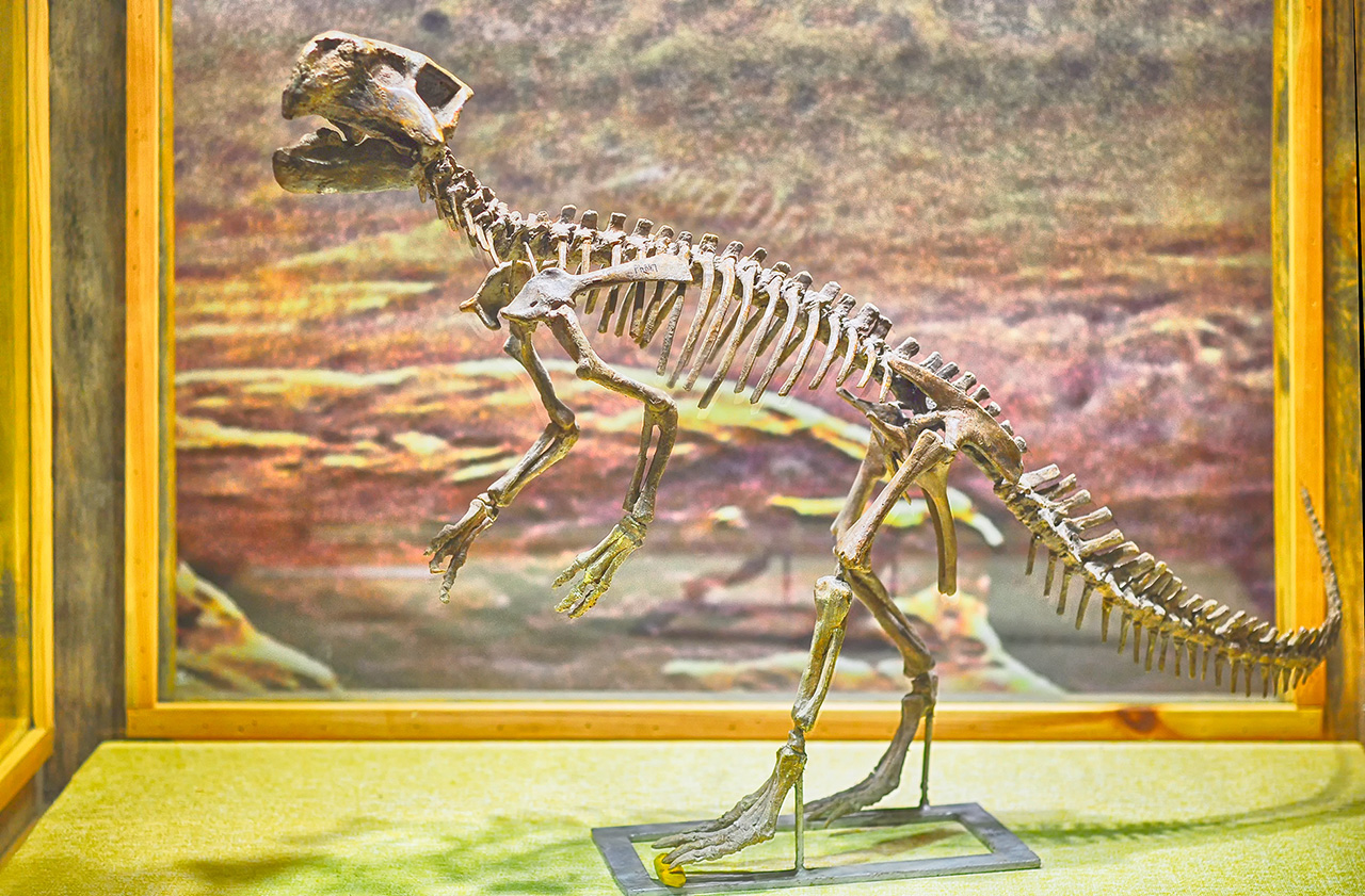 【鹦鹉嘴龙】因生有一张酷似鹦鹉的嘴而得名,不如他的远亲三角龙广为大众所知,但他们是已知最完整的恐龙之一。已发现超过400个个体,包括许多完整骨骸。科学家由它的体形及生存年代来推断,认为鹦鹉嘴龙可能是大部分角龙类恐龙的祖先。